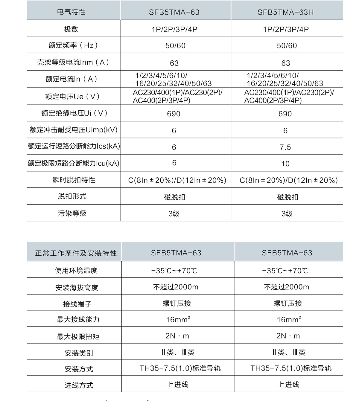 SFB5TMA-63單磁式斷路器〈以下簡稱斷路器〕主要適用于交流50Hz/60Hz,顏定電流1A至63A。憫定電壓230V或40V的配電網(wǎng)絡(luò)中。適用于醫(yī)療IT配電系統(tǒng)、電機(jī)保護(hù)及建筑消防系統(tǒng)等領(lǐng)域的低壓終端配電,作為短路保護(hù)開關(guān),也可與熱繼電器或電機(jī)啟動(dòng)器配合使用,實(shí)現(xiàn)過載保護(hù)。