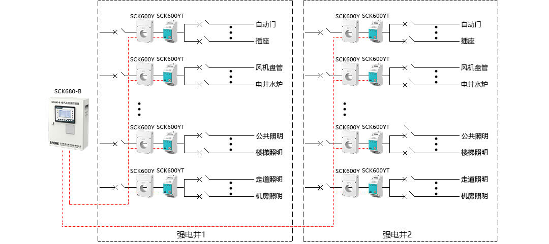 當供電線路泄漏電流大于500mA時,需在其下一級配電箱設置電氣火災監控探測器。可在每個配電箱內安裝一個SCK600Y一體式電氣火災監控探測器、SCK600YT測溫式電氣火災監控探測器和NTC溫度傳感器,一層樓或一個強電井配置一臺SCK630監控單元。