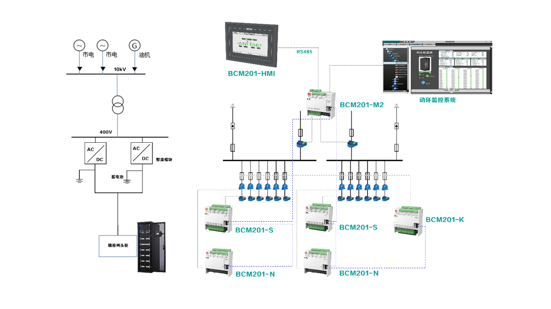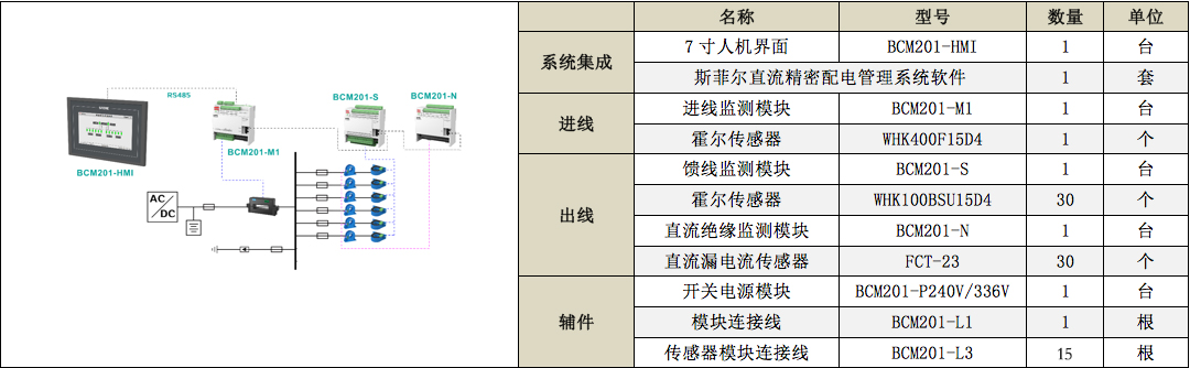 進線回路采用BCM201-M1模塊監測1路直流進線,出線回路配置一個BCM201-S監測模塊,實現對進線及各個出線回路的電壓、電流、有功功率、電能、極值、需量。
