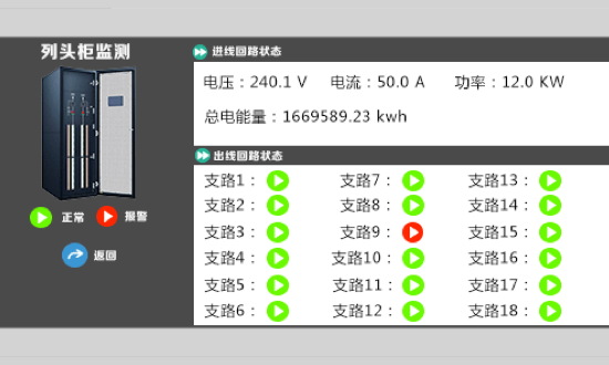 實時監測各個回路能耗及報警狀態,便于客戶運營及分析。本地采用7寸人機界面,交互操作方便,提供以太網接口與上級監控系統連接。